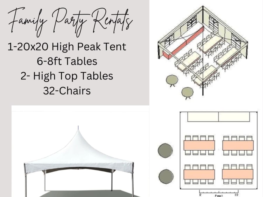 *A 20’x20’ High Peak Tents offer shade, a place to sit, or an area to comfortably prepare food for your guests! Invite your friends, family, and the entire block to experience these clean, professional, and sturdy' 20’x20’ High Peak Tent. Each tent can be set up on grass or pavement.